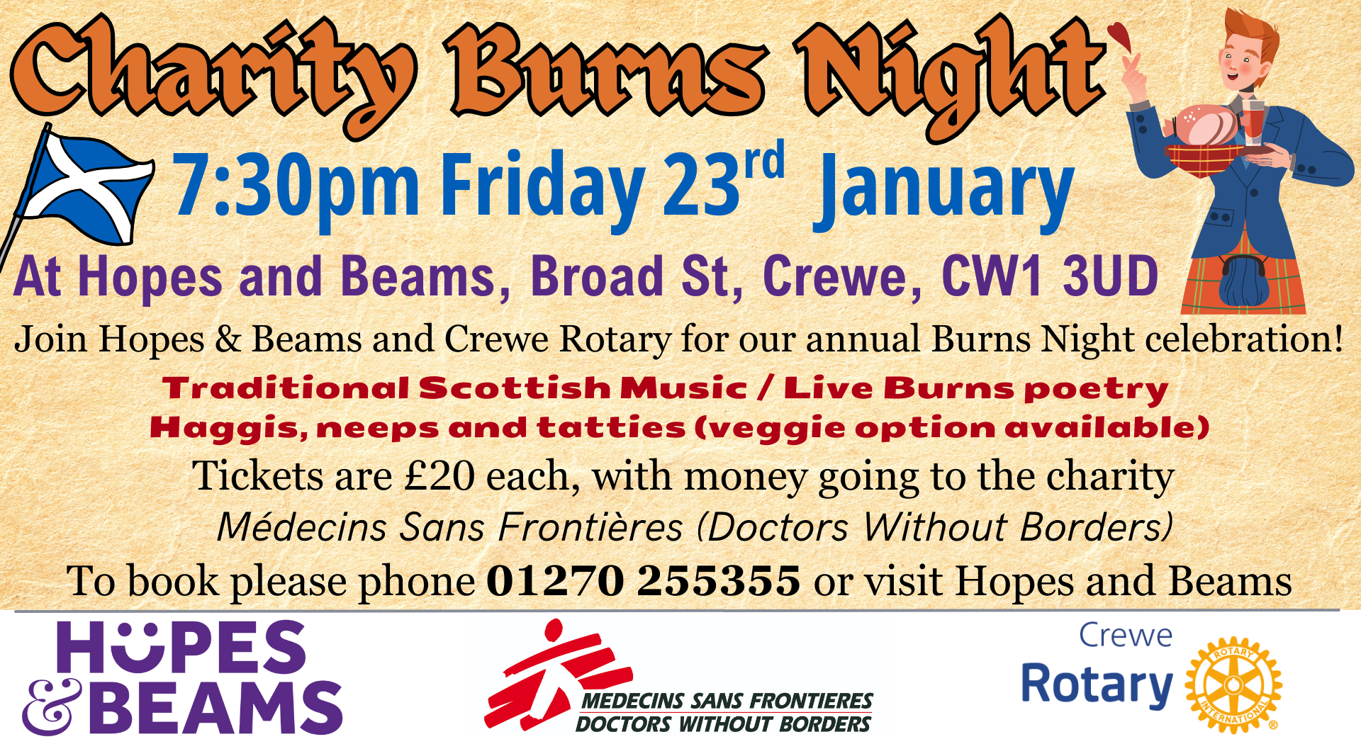 Join Hopes & Beams and Crewe Rotary for our annual Burns Night celebration!